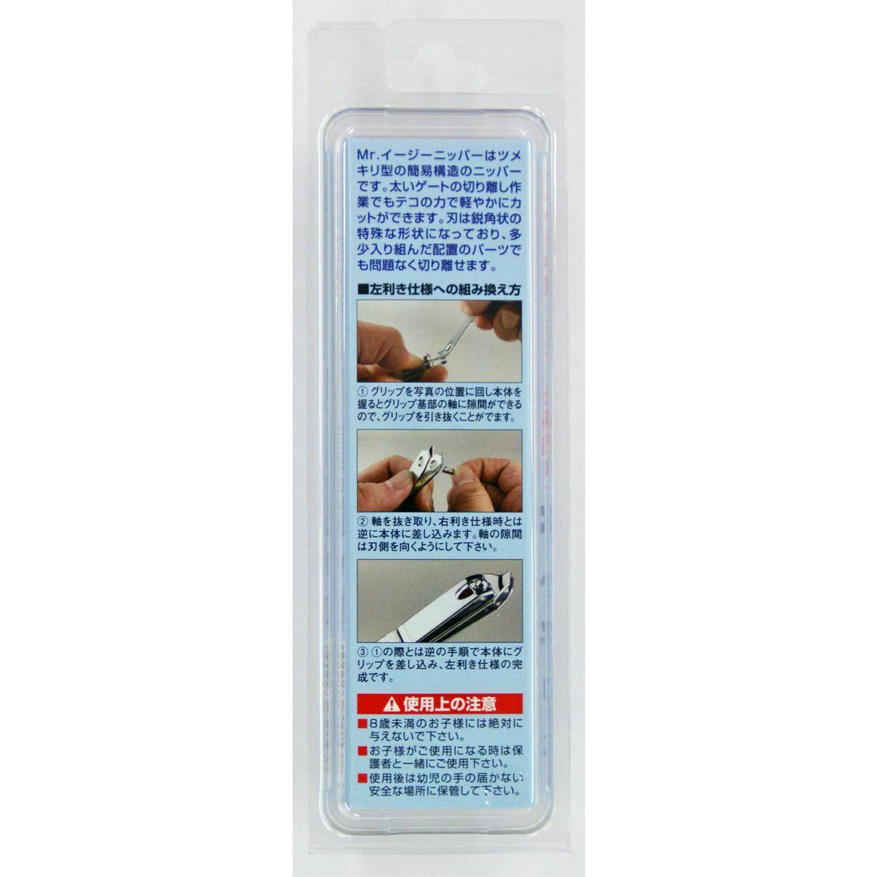 This is a nail clipper type and simple nipper set, so you can cut lightly with it using the power of leverage. It is most suitable for people who are just starting out making plastic models casually or children who are not used to using edged tools. Changing over the shaft attachment makes it more easy to use for left-handed people.