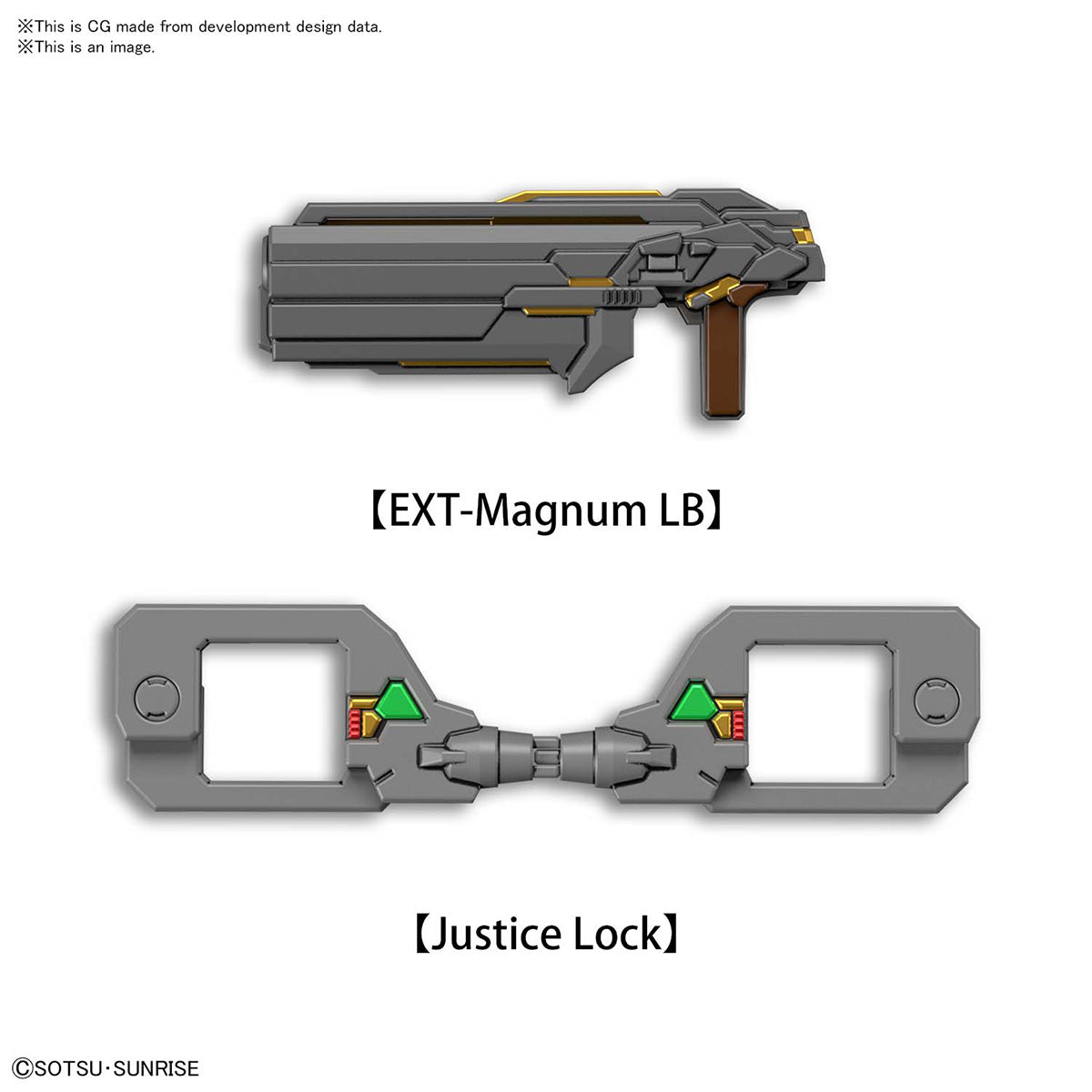 With a unique face design, the colors are constructed by a combination of layered structured clear parts, slit mask parts and stickers. Equipped with EXT-Magnum LB (Handgun) and Justice Lock used as handheld weapon to arrest criminals.